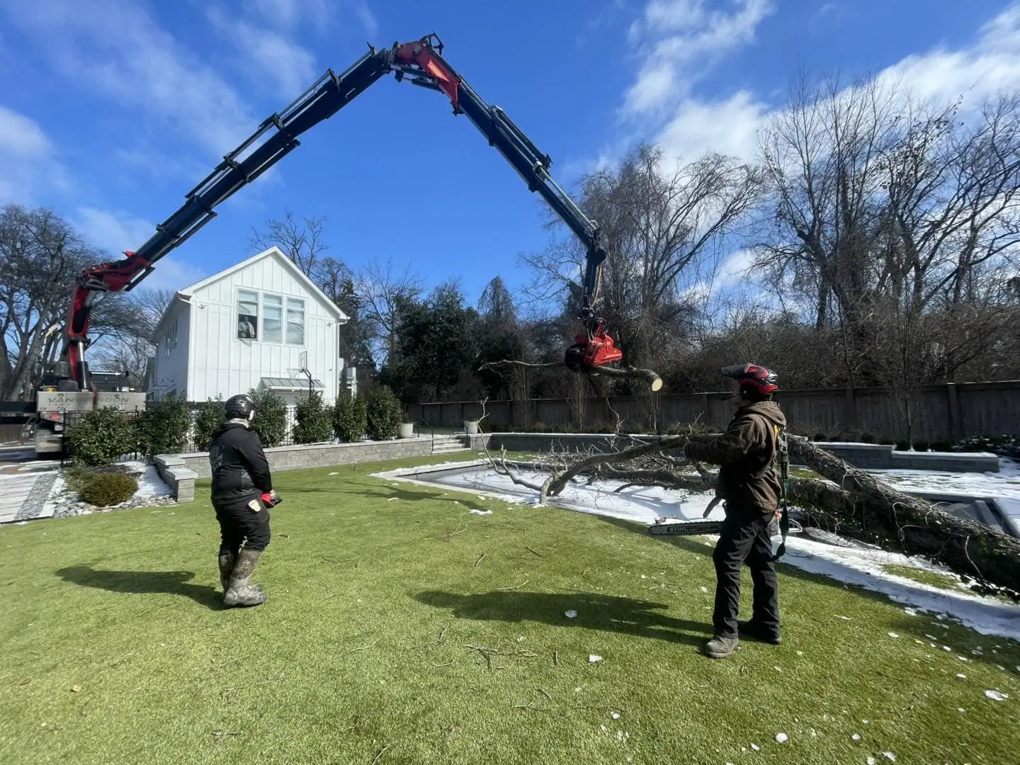Large trees growing near homes or structures can be removed safely using crane assistance.